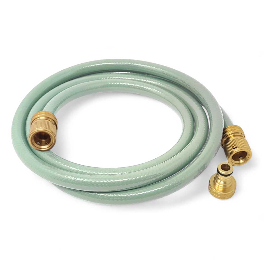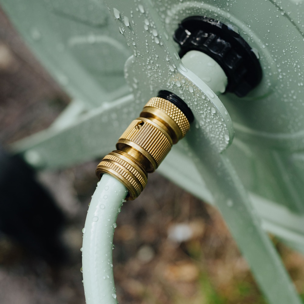Unsere Anschlussgarnitur ist eine praktische Verbindungseinheit, mit der du mühelos deinen Schlauchwagen oder deine Schlauchtrommel mit dem Wasserhahn verbinden kannst. Der 2 Meter lange formstabile Gartenschlauch aus umweltfreundlichem Recyclingmaterial, kombiniert mit hochwertigen Messinganschlüssen, sorgt für eine zuverlässige Wasserzufuhr. Er ist UV-beständig, frei von Phthalaten – für eine harmonische Integration in deinen Garten.