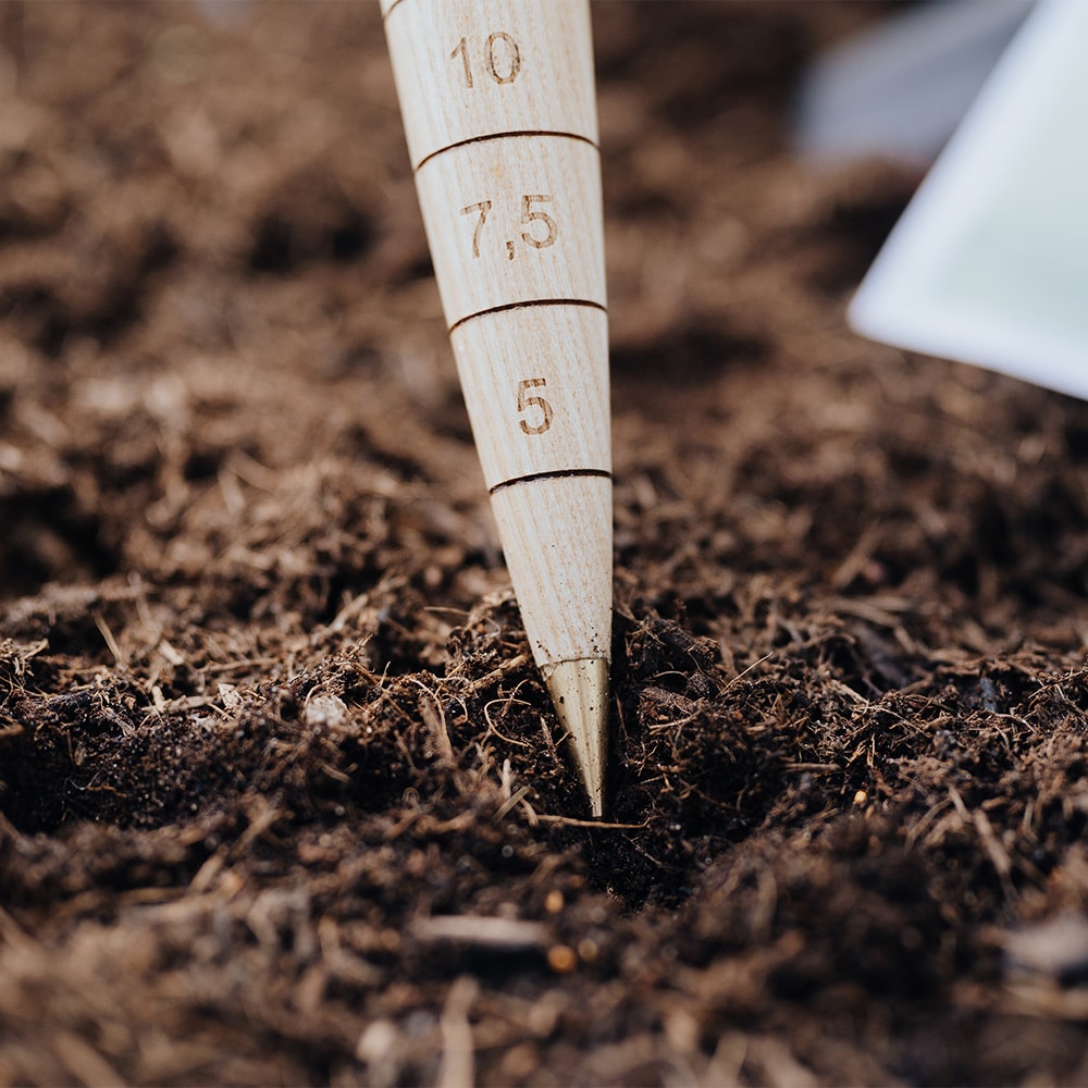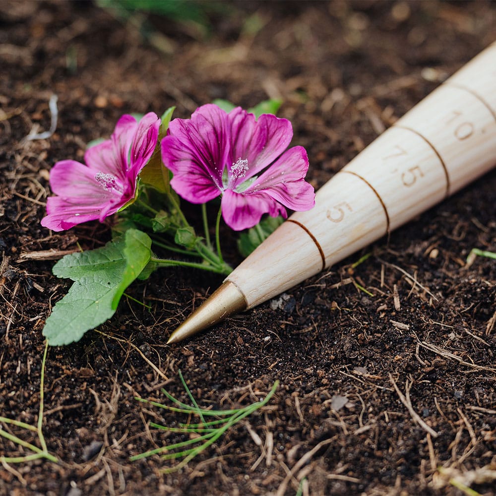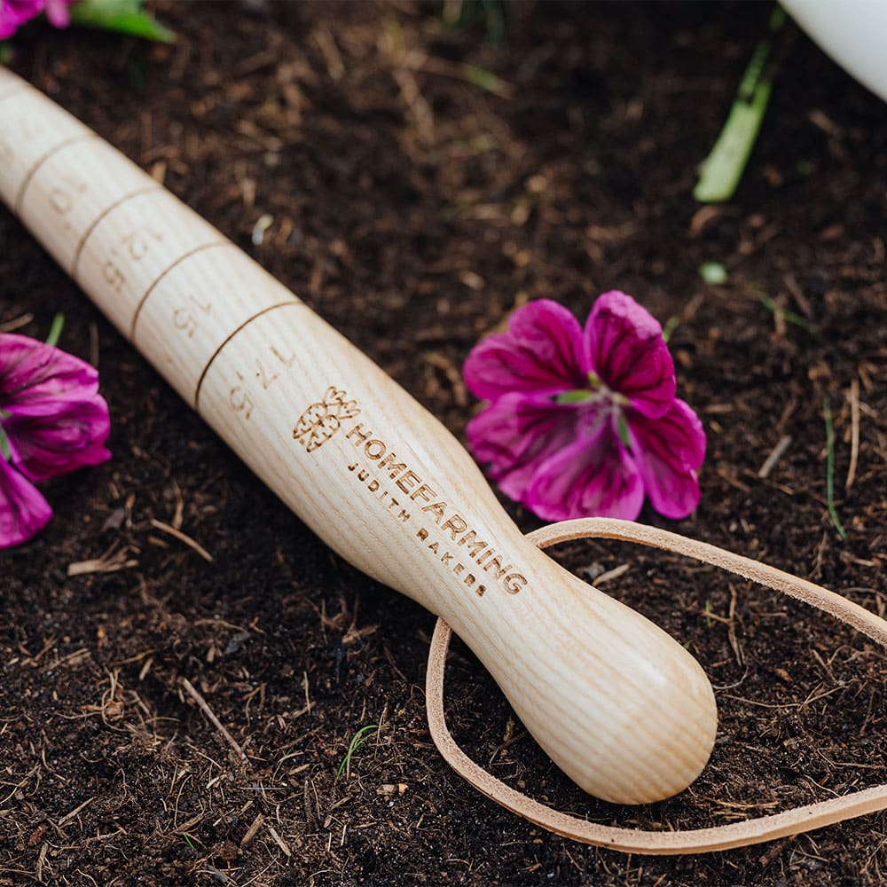 Der Homefarming Aussaat-Assistent hilft dir mit einem Handgriff gleich doppelt: Du kannst die Saattiefe zentimetergenau abmessen und mit der Messing-Spitze des Holzes auch gleich ein Loch für die Saat in die Erde stechen.