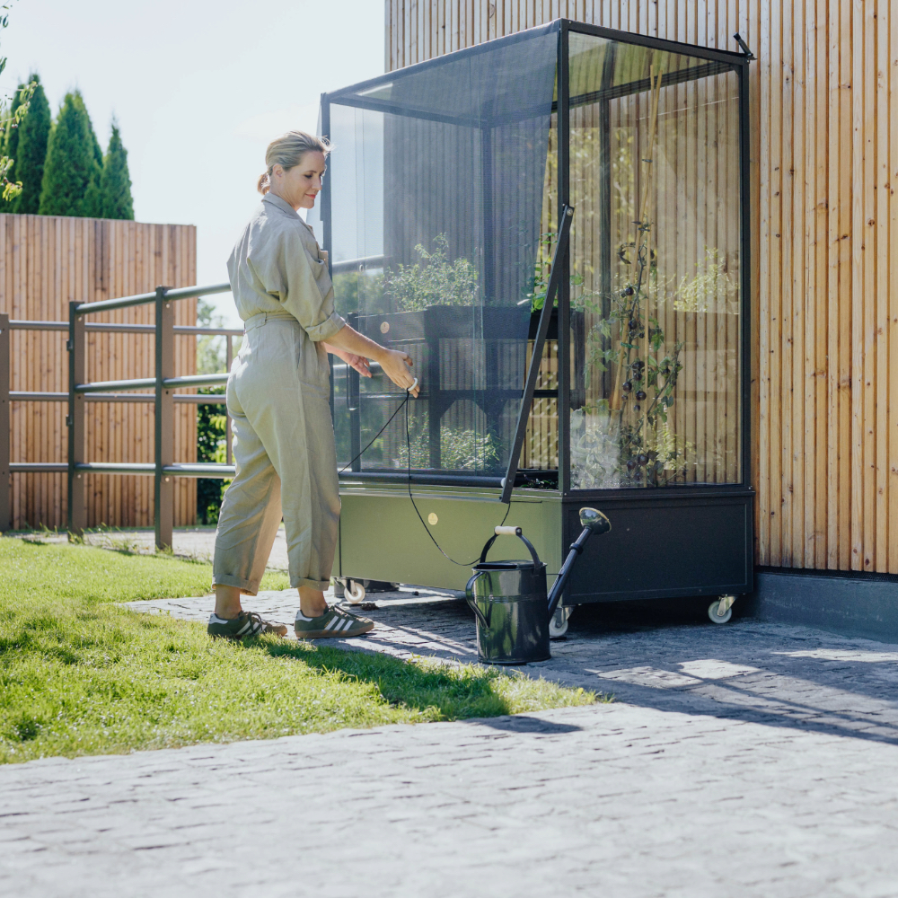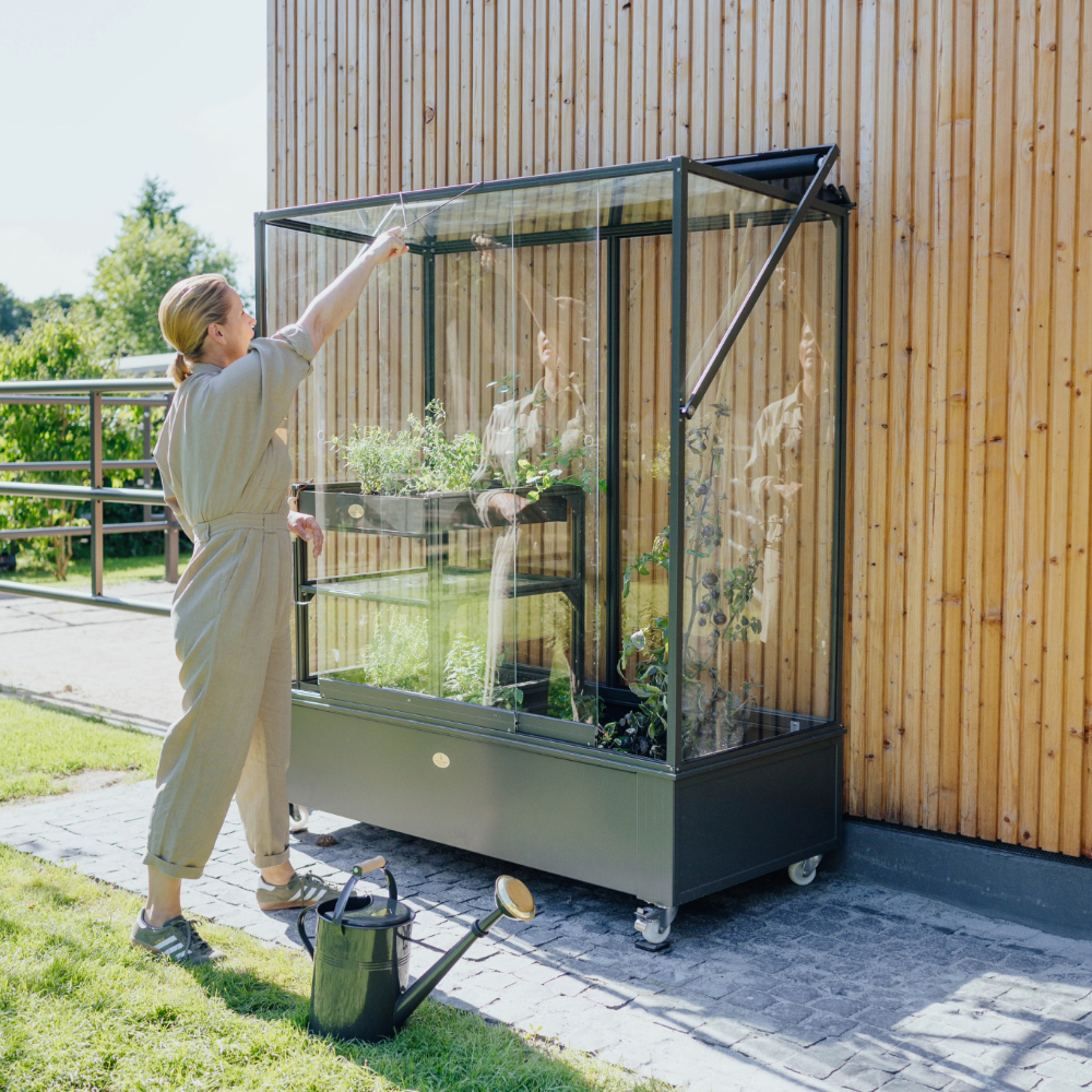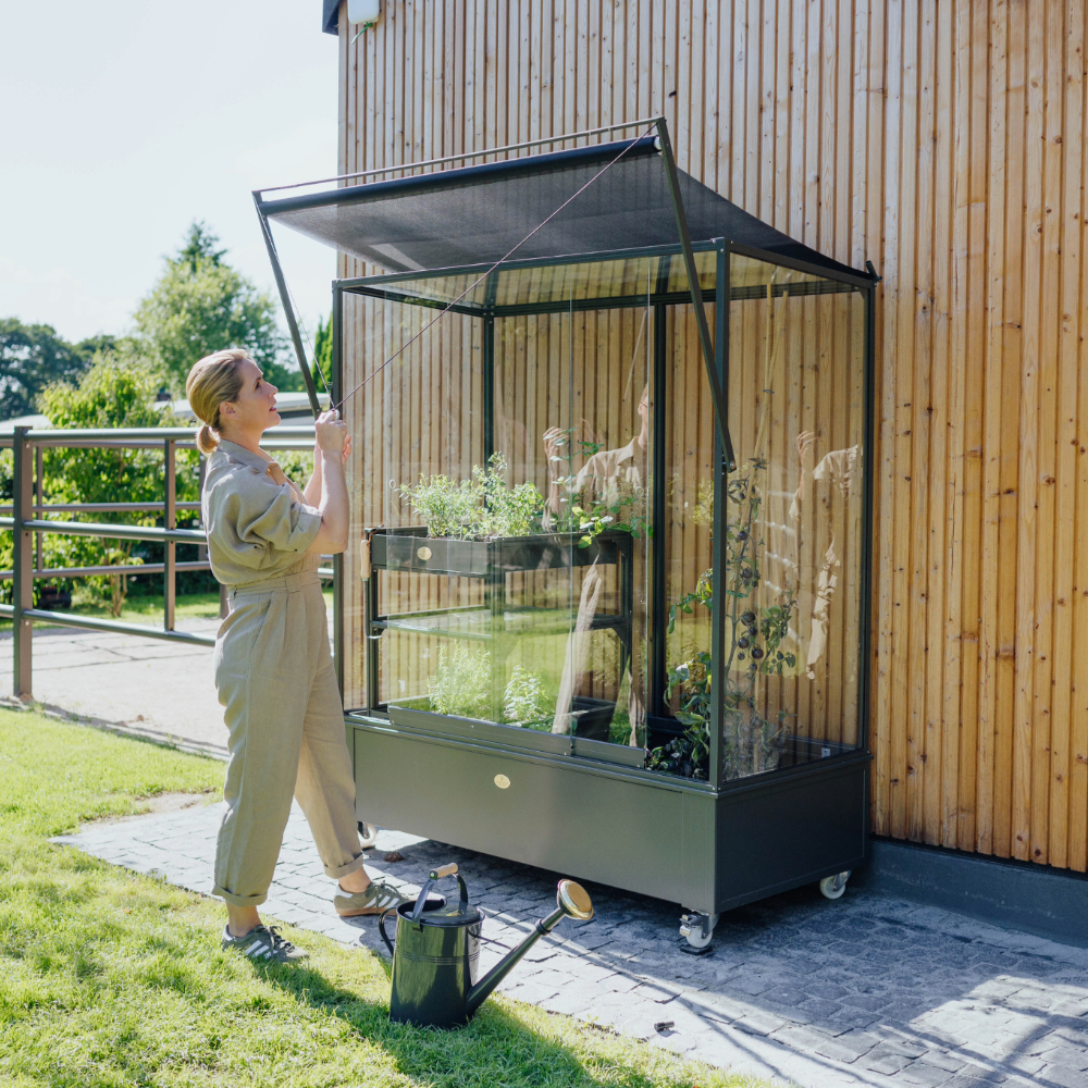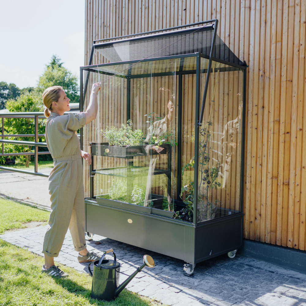 Das Sonnenschutz-/Schädlingsschutz-Gewebe ist schwarz, die Alu-Konstruktion Homefarming-grau und damit passend zu den anderen Produkten der Kollektion „Homefarming meets Hoklartherm“. Das hochwertige Fiberglas-Gewebe ist UV- und witterungsbeständig.