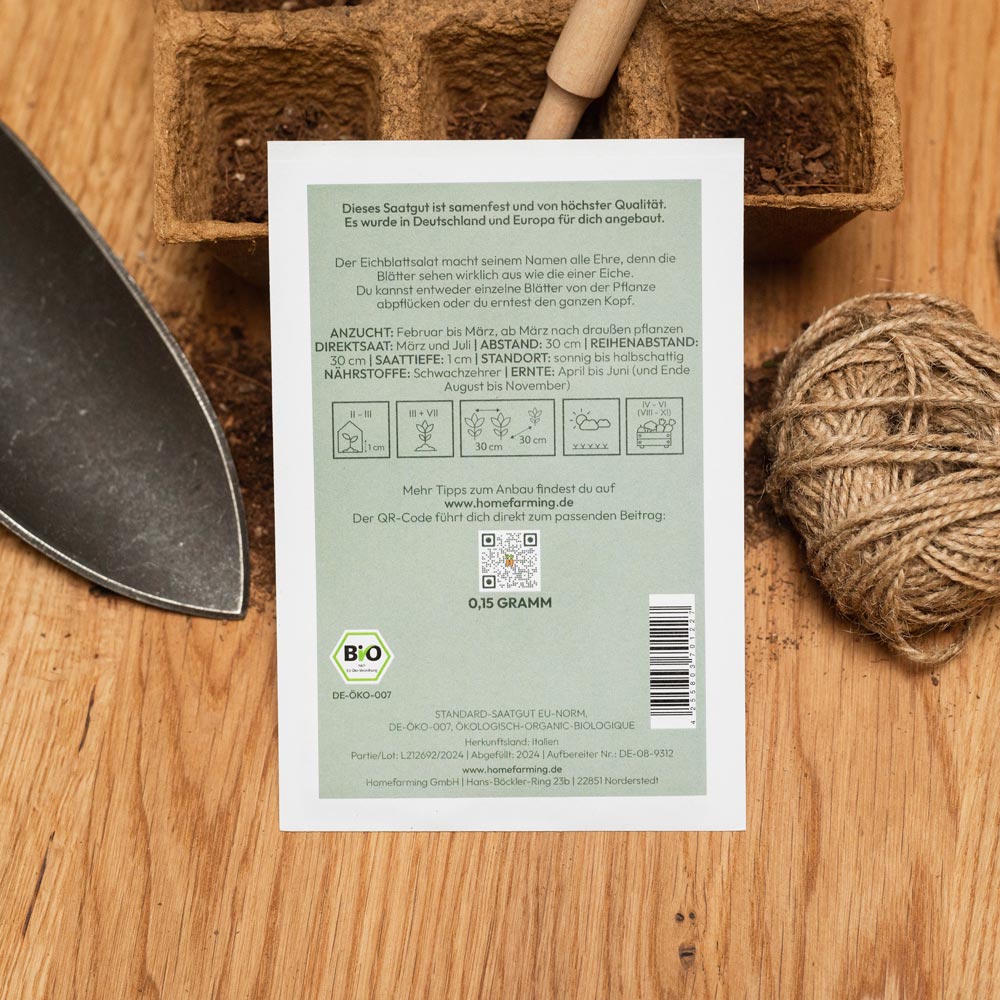 Das Bio-Saatgut stammt aus regionalem Anbau in Deutschland und Europa, wird von einem Familienunternehmen in Süddeutschland abgefüllt, ist samenfest und BIO-zertifiziert. Du bekommst also geprüfte Qualität. Auf der Saatguttüte findest du eine Kurz-Anleitung zum Säen, Pflanzen und Ernten und Angaben zum idealen Standort. Sehr ausführliche Informationen haben wir in unseren Steckbriefen hinterlegt, die du bequem über den QR-Code auf der Tüte abrufen kannst.
