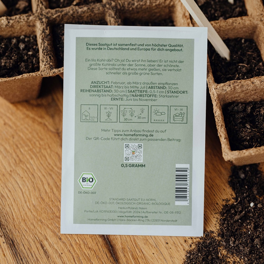 Das Bio-Saatgut stammt aus regionalem Anbau in Deutschland und Europa, wird von einem Familienunternehmen in Süddeutschland abgefüllt, ist samenfest und BIO-zertifiziert. Du bekommst also geprüfte Qualität. Auf der Saatguttüte findest du eine Kurz-Anleitung zum Säen, Pflanzen und Ernten und Angaben zum idealen Standort. Sehr ausführliche Informationen haben wir in unseren Steckbriefen hinterlegt, die du bequem über den QR-Code auf der Tüte abrufen kannst.