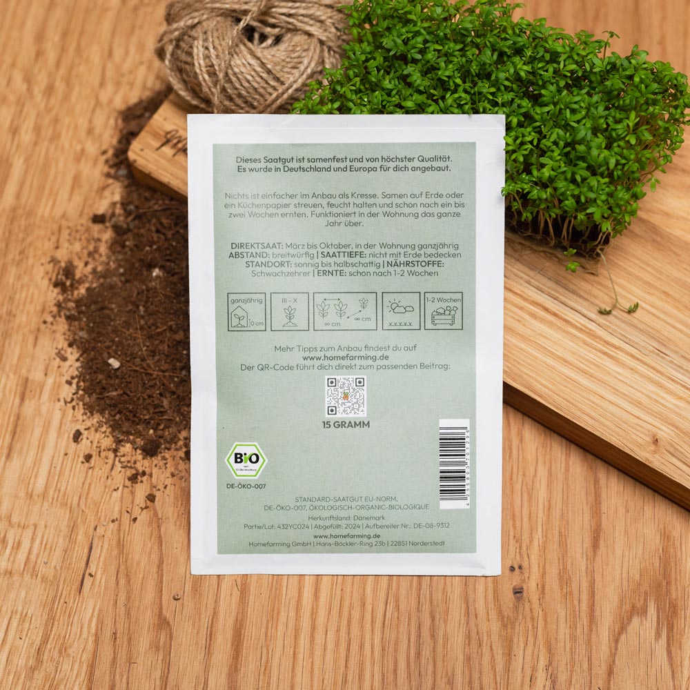 Das Bio-Saatgut stammt aus regionalem Anbau in Deutschland und Europa, wird von einem Familienunternehmen in Süddeutschland abgefüllt, ist samenfest und BIO-zertifiziert. Du bekommst also geprüfte Qualität. Auf der Saatguttüte findest du eine Kurz-Anleitung zum Säen, Pflanzen und Ernten und Angaben zum idealen Standort. Sehr ausführliche Informationen haben wir in unseren Steckbriefen hinterlegt, die du bequem über den QR-Code auf der Tüte abrufen kannst.