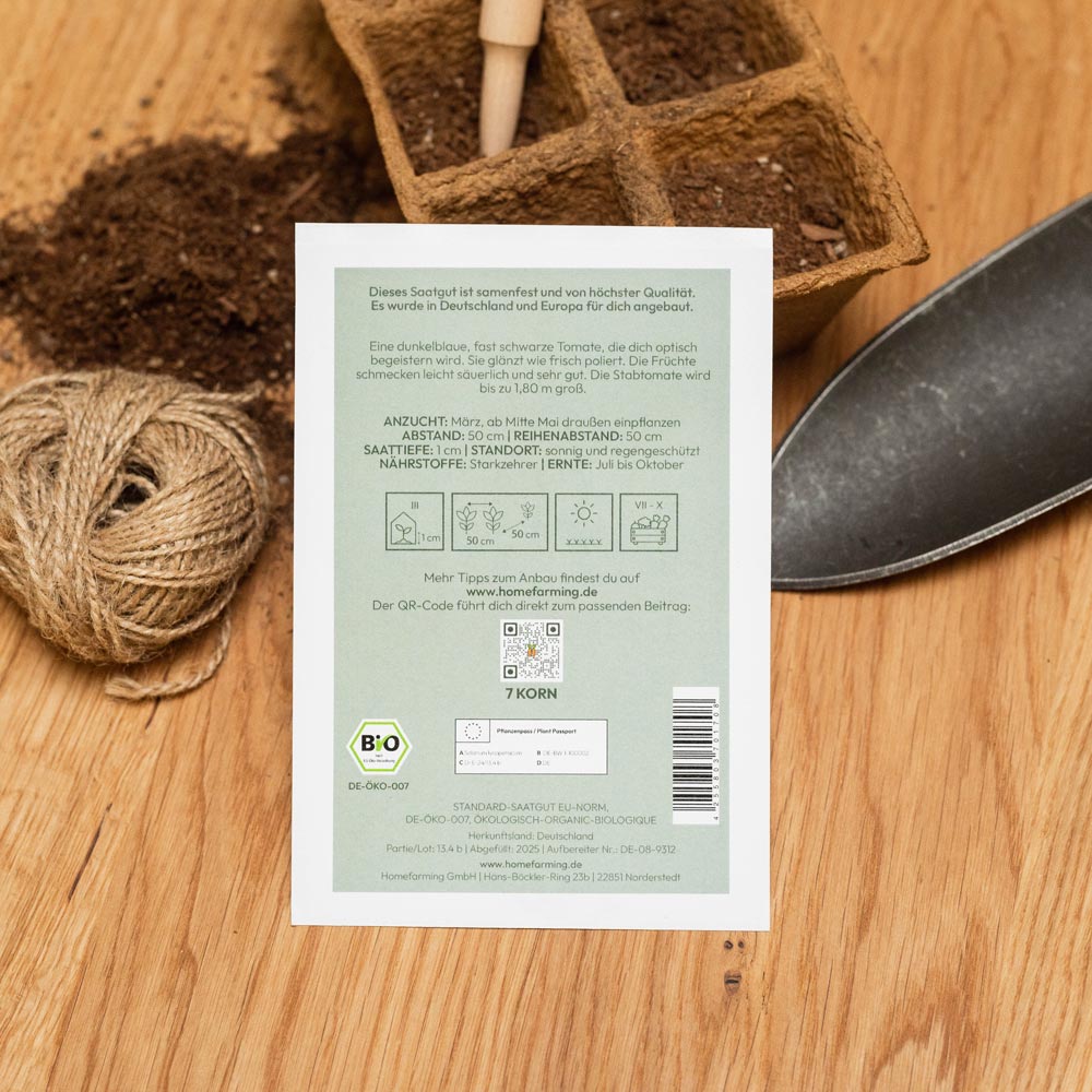 Das Bio-Saatgut stammt aus regionalem Anbau in Deutschland und Europa, wird von einem Familienunternehmen in Süddeutschland abgefüllt, ist samenfest und BIO-zertifiziert. Du bekommst also geprüfte Qualität. Auf der Saatguttüte findest du eine Kurz-Anleitung zum Säen, Pflanzen und Ernten und Angaben zum idealen Standort. Sehr ausführliche Informationen haben wir in unseren Steckbriefen hinterlegt, die du bequem über den QR-Code auf der Tüte abrufen kannst.