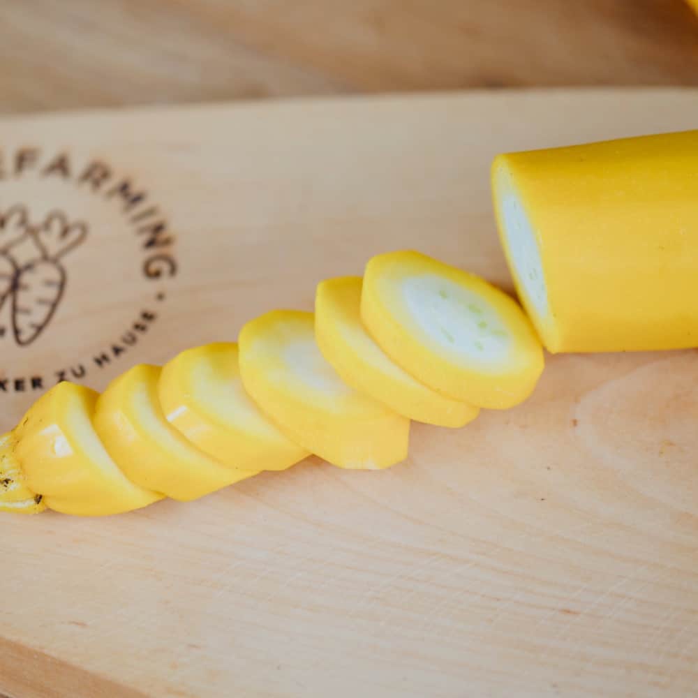 Diese Zucchini bringen Farbe und Vielfalt auf den Teller! Die Zucchini-Sorte “Gold Rush” gehört geschmacklich zu den besten gelben Zucchini-Sorten. Sie wächst buschförmig und ist sehr ertragreich. Auch ihre Blüten sind essbar.