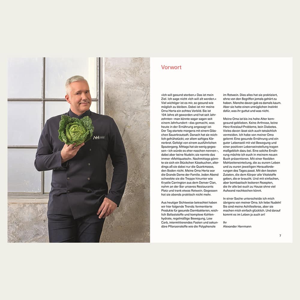 Viele wünschen sich eine ausgewogenere, gesunde Ernährung. Aber der Alltag und mangelndes Wissen kommt ihnen nicht allzu selten in die Quere. Genau dieser Thematik widmet sich Alexander Herrmann in seinem Buch Weil’s einfach gesünder ist – inspiriert von einer ganz besonderen Person: Die Großmutter des Spitzenkochs hat das stolze Alter von 104 erreicht.