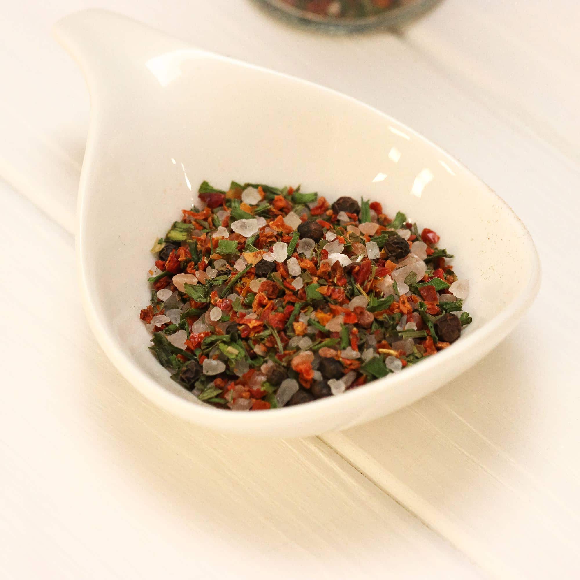 Zutaten: Rosa Kristallsalz 66%, Tomate, schwarzer Pfeffer, rote Paprika, Schnittlauch, Liebstöckel