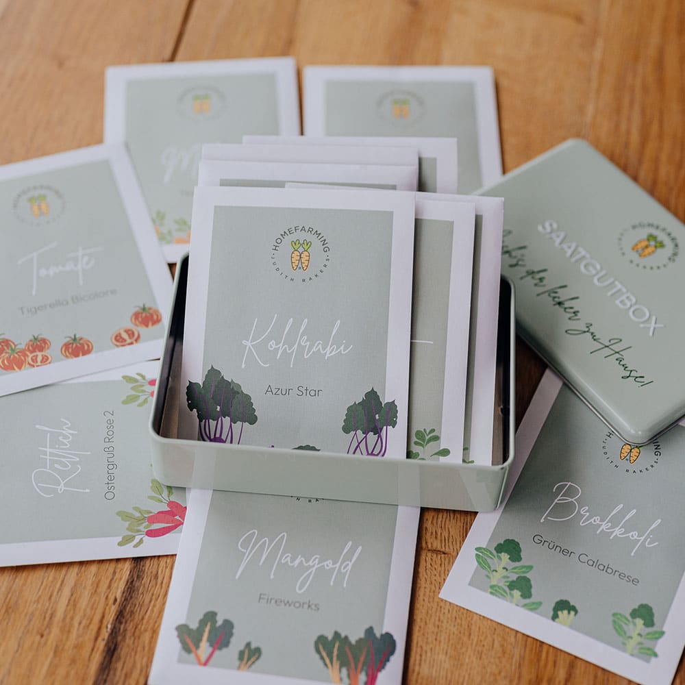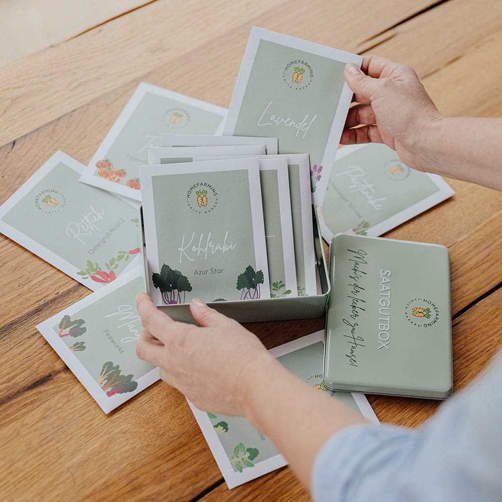 Jeden Monat säen und ernten. In dieser hochwertigen, wiederverwendbaren und hübsch geprägten Box findest du BIO-Saatgut, das dich durch ein ganzes Homefarming-Jahr begleiten wird. In dieser Box steckt also ein Jahr Gemüseglück.