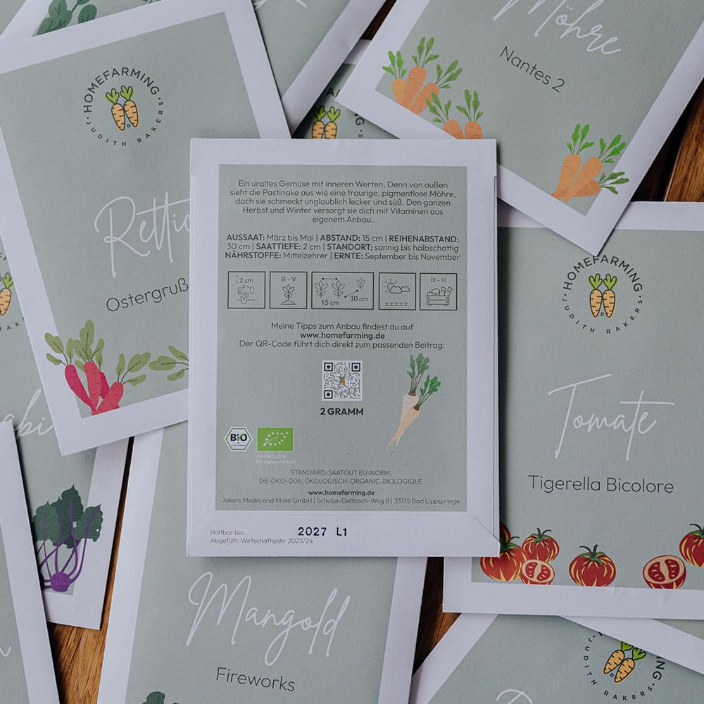Auf jeder Saatguttüte findest du eine genaue Anleitung zur Aussaat, Pflege und Ernte. Außerdem führen dich QR-Codes auf den Saatguttüten zu ausführlichen Anleitungen hier im kostenlosen Magazin Homefarming.de. Es warten viele weitere Tipps und sogar Rezepte zur Zubereitung auf dich.