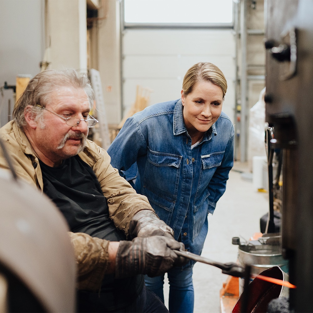 Verwendet wird sogenannter Schweden-Stahl, der besonders fest, zäh und pflegeleicht ist. In glutheißen Öfen wird der Stahl zuerst durch Hitze formbar gemacht und dann unter dem Schmiedehammer in Handarbeit bearbeitet, geschliffen und, wo nötig, auch geschärft.