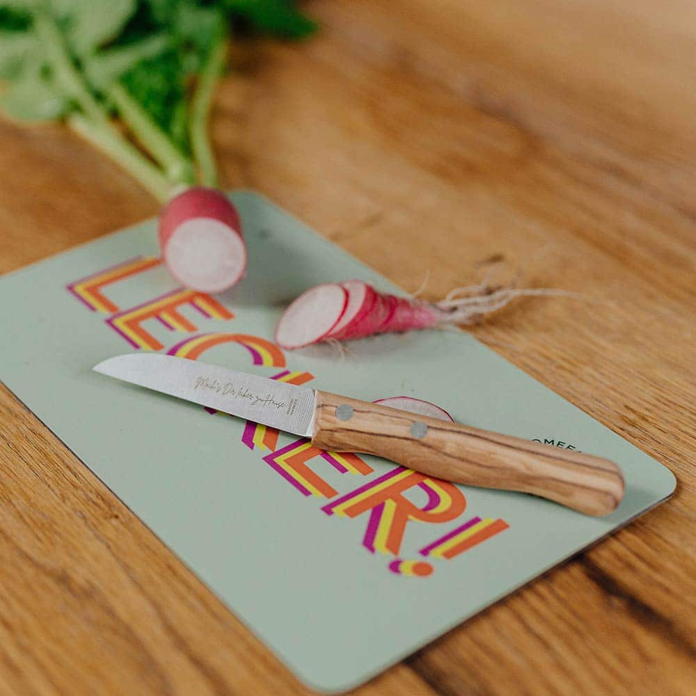 Die original Solinger Klinge ist aus rostfreiem Stahl gefertigt und mit dem Schriftzug „Mach´s dir lecker zu Hause“ graviert. Der Griff trägt das Homefarming-Logo.
