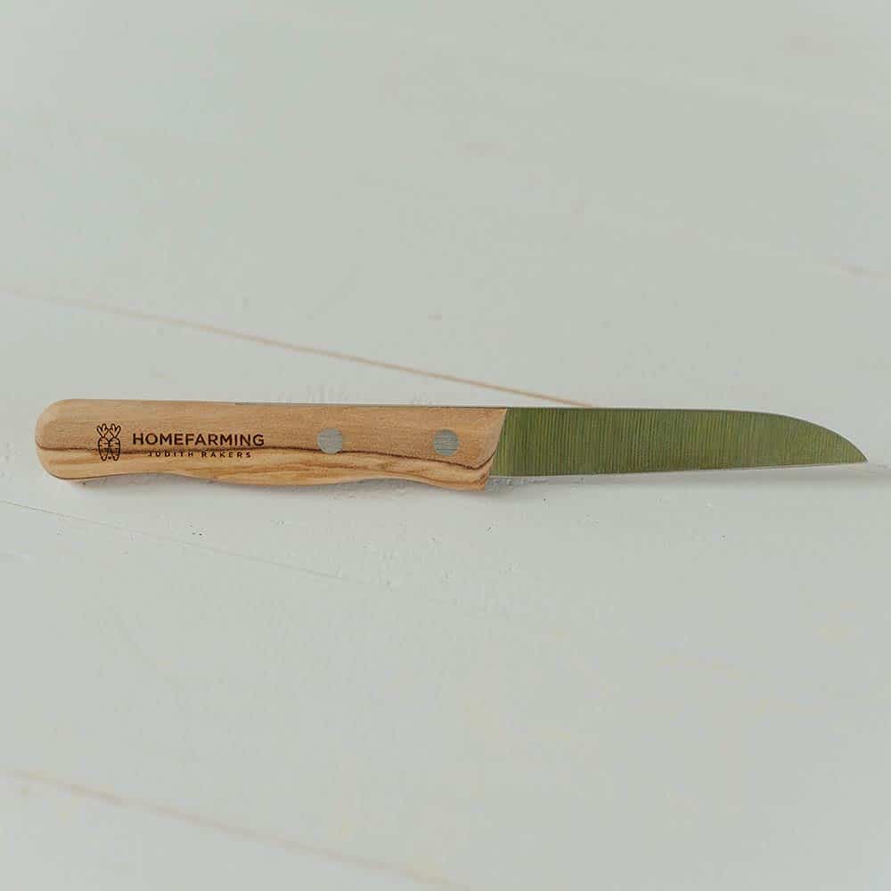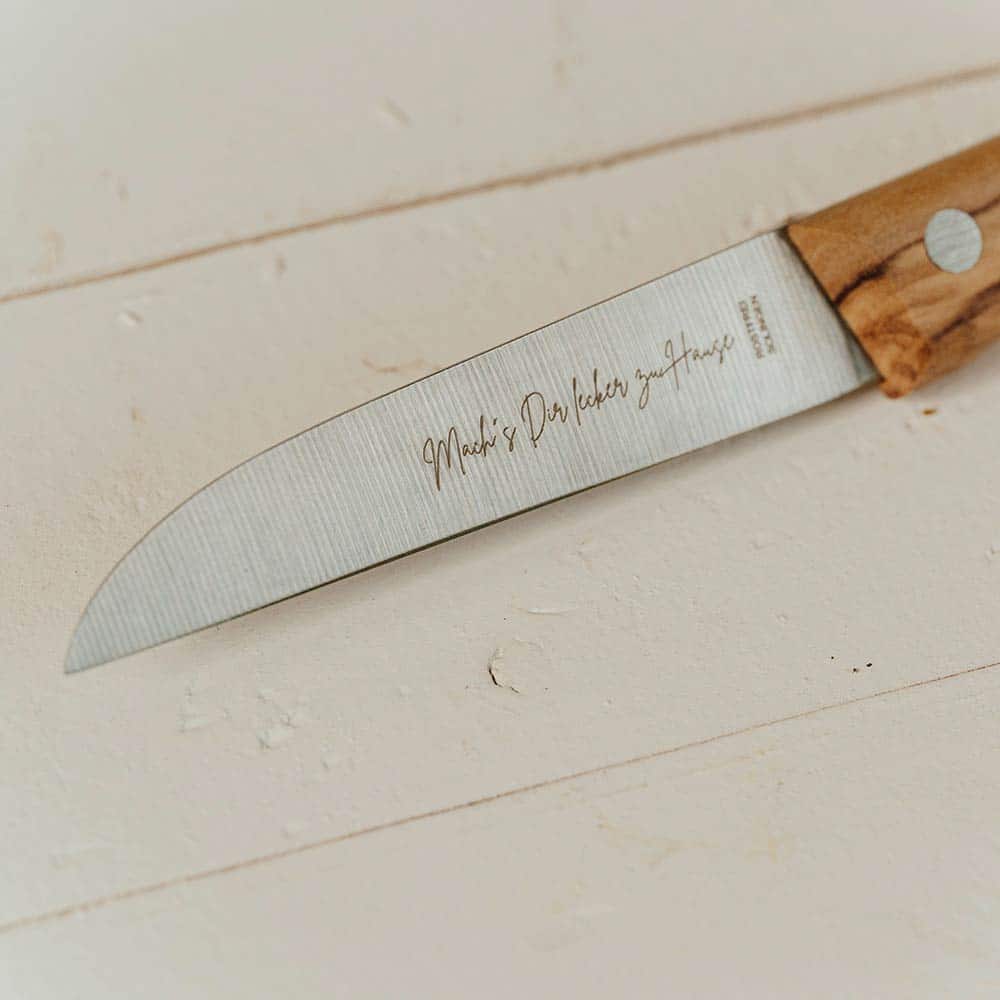 Dies ist dein neues Lieblings-Gemüsemesser. Denn es schneidet nicht nur scharf und präzise, es liegt auch gut in der Hand, weil es plastikfrei ist und der Griff aus nachhaltigem, samtig geschliffenem Olivenholz besteht.