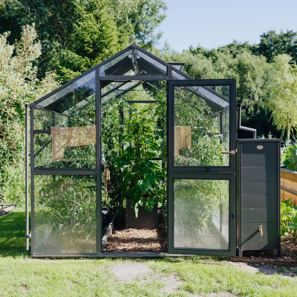 Die Regenrinnen am Gewächshaus Lotti leiten das Wasser direkt in die Tonne – du musst nichts weiter machen. Die dunkle Wassertonne in der Kollektionsfarbe Homefarming-grau liefert das Wasser immer perfekt vorgewärmt. Denn gerade im Sommer kann der Temperatur-Unterschied zwischen der warmen Luft und dem kalten Wasser aus dem Gartenschlauch einen Kälteschock für deine Pflanzen bedeuteten. Regenwasser in der Tonne zu sammeln ist also nicht nur nachhaltig, sondern auch tatsächlich besser für deine Pflanzen.