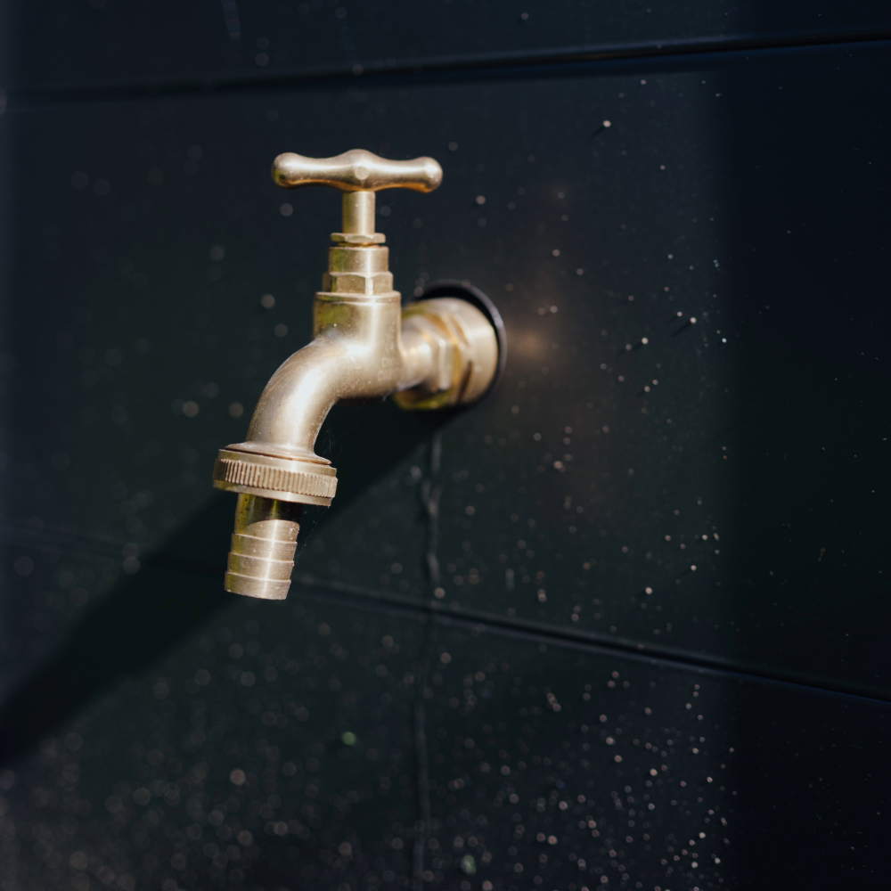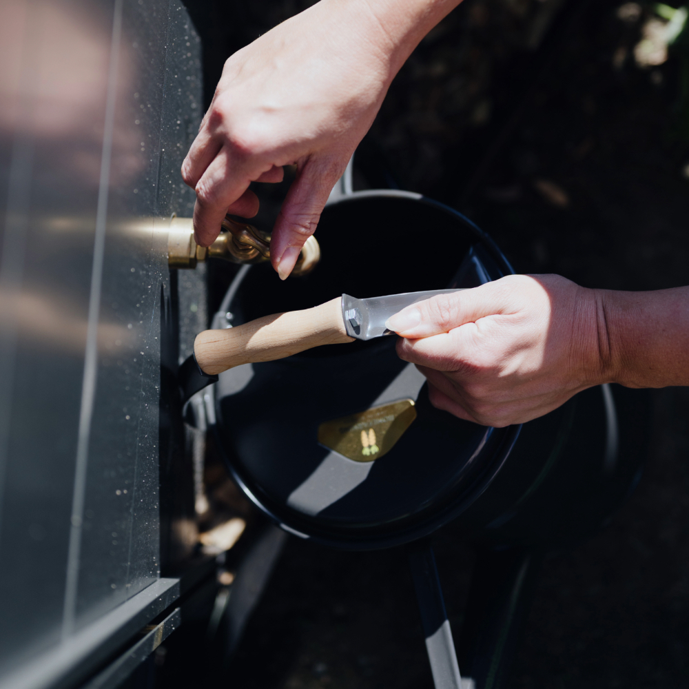 Der messingfarbene Wasserhahn (passend zu den messingfarbenen Details des Gewächshauses Lotti) ist so positioniert, dass handelsübliche Gießkannen ohne Probleme darunter gestellt werden können. Die Wassertonne Jack fasst 120 Liter.