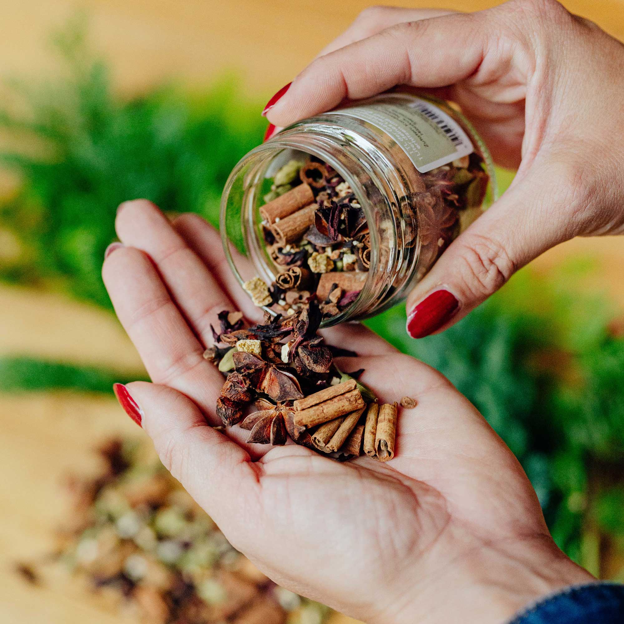 Zutaten: Kardamonkapseln, Cassia Zimt, Hibiscus, Nelken, Orangenschale, Sternanis, Zitronenschale
