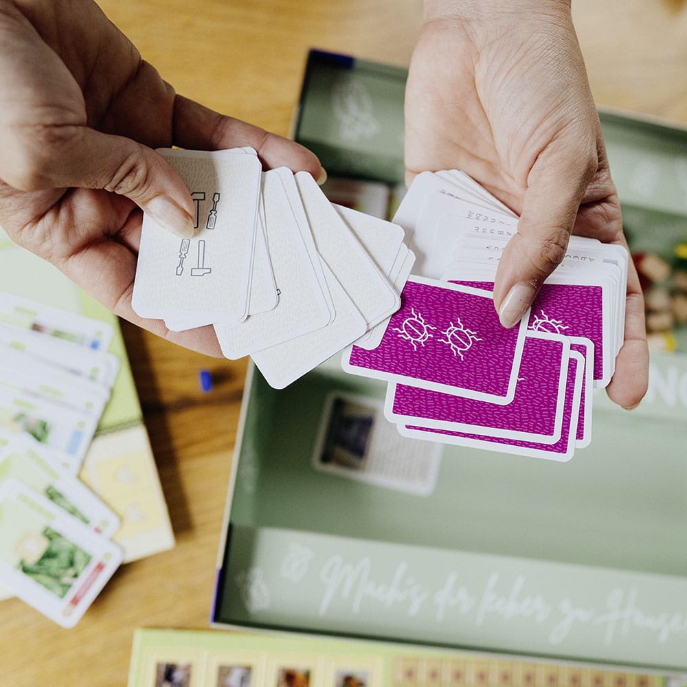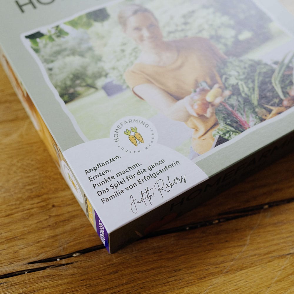 Im plastikfreien Homefarming Brettspiel für die ganze Familie können zwei bis vier Spielerinnen und Spieler ihren eigenen kleinen Garten bewirtschaften. Nach drei Runden wird abgerechnet: Wer hat am meisten geerntet und den Platz in seinem Garten am geschicktesten genutzt? Wer hatte die Jahreszeiten und Schädlinge im Griff? Und bei wem sind sogar Federfreunde eingezogen, die Extra-Punkte bringen? Echtes Gartenwissen wird in diesem Spiel zum Homefarming-Spaß für die ganze Familie!
