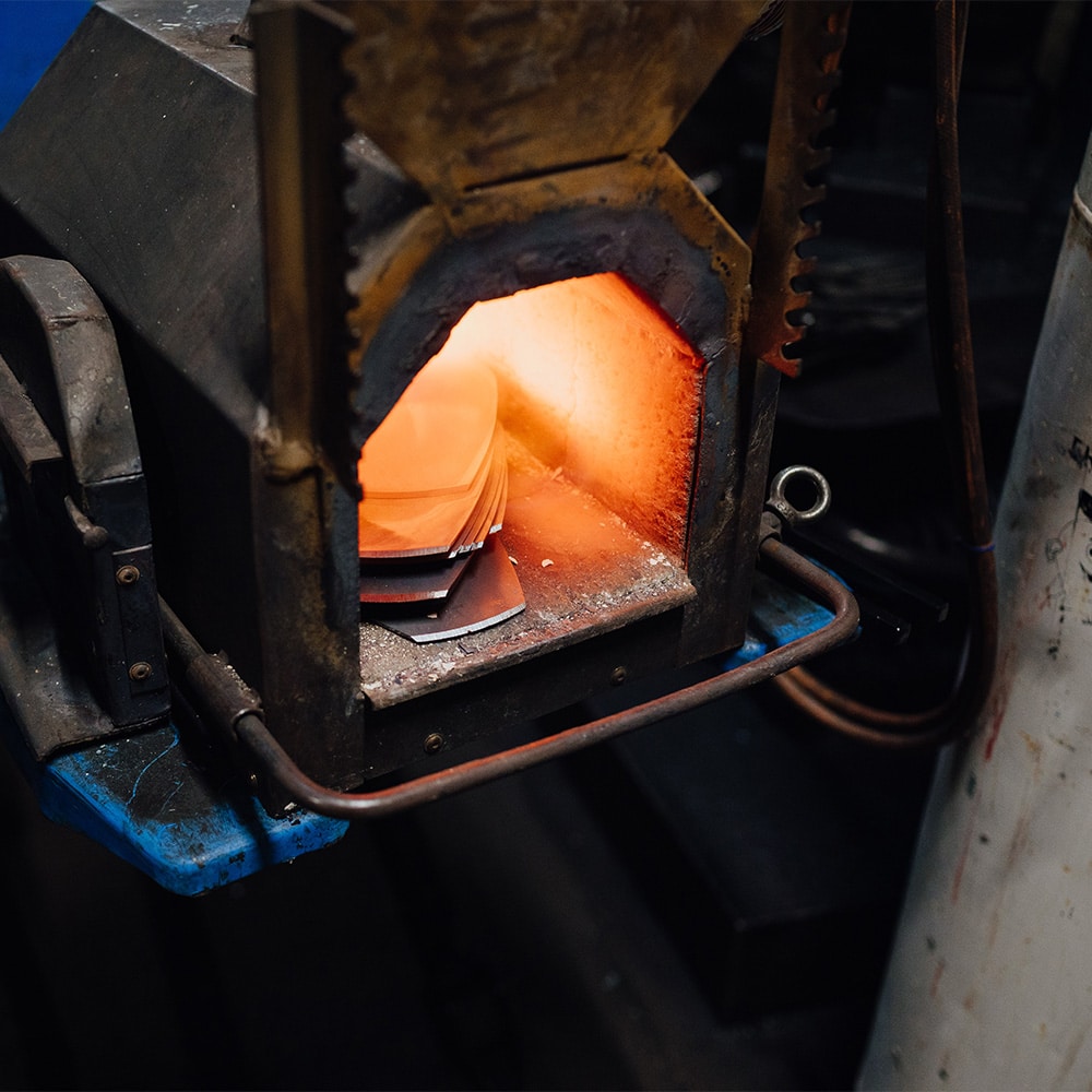 Verwendet wird sogenannter Schweden-Stahl, der besonders fest, zäh und pflegeleicht ist. In glutheißen Öfen wird der Stahl zuerst durch Hitze formbar gemacht und dann in Handarbeit bearbeitet, geschliffen und, wo nötig, auch geschärft.