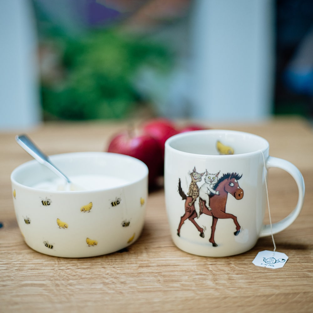 Sie ist aus Fine Bone China mit spülmaschinenfestem Druck – von Hand dekoriert. Zur Serie gehören auch passende Frühstücksbrettchen und Servietten, sowie zwei Becher mit niedlichen Illustrationen.
