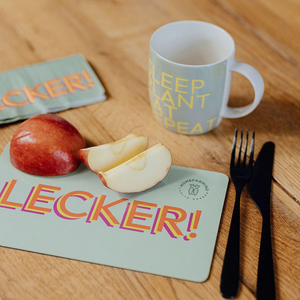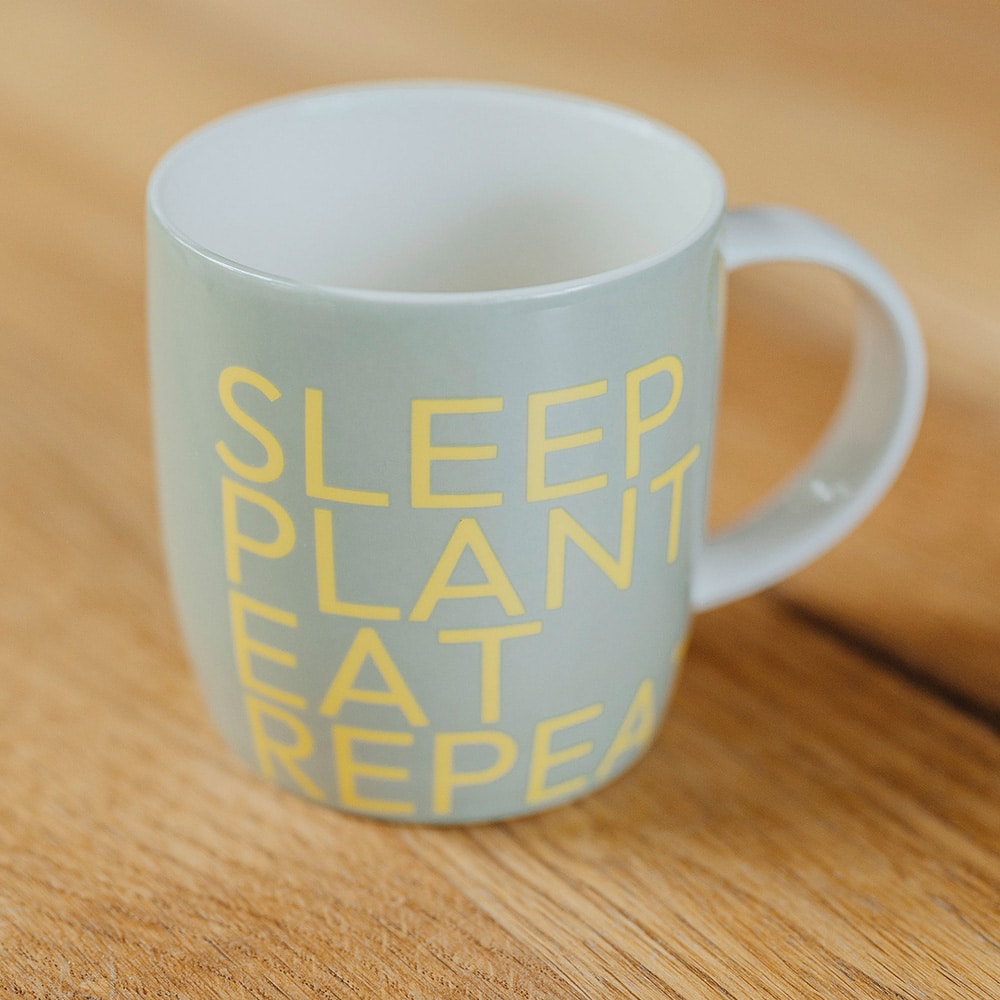 Der Becher für Gartenfreunde. Aus Fine Bone China mit spülmaschinenfestem Druck „Sleep – Plant – Eat – Repeat“ in Orange und Gelb auf Grün. Hergestellt in Deutschland. Denn regionale Produktion ist uns wichtig bei „Homefarming Judith Rakers“.