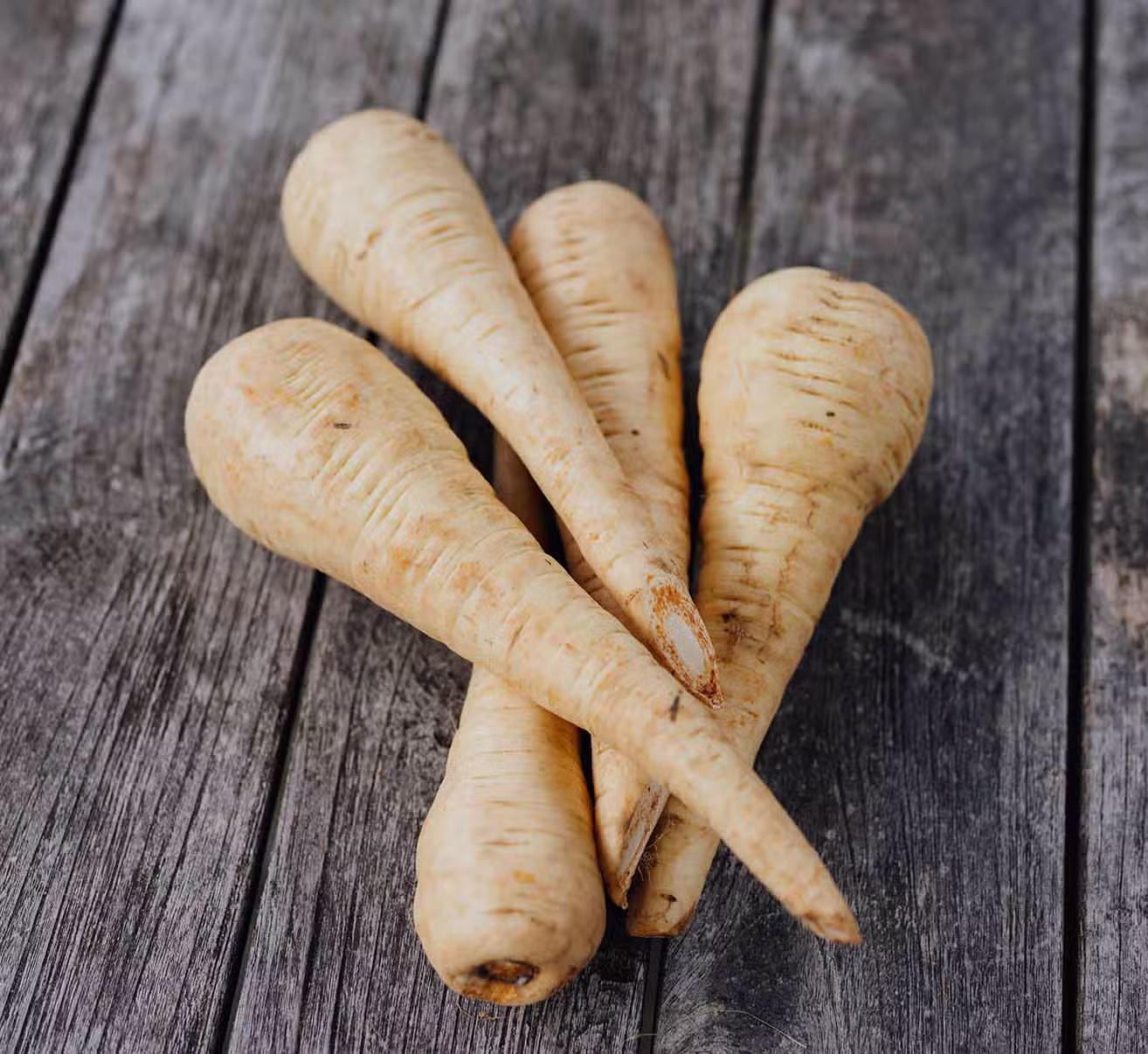 Pastinaken und Petersilienwurzeln sehen sich sehr ähnlich. Unterscheiden kannst du sie daran, dass bei Pastinaken der Blattansatz am oberen Ende der Wurzel eingesunken ist, bei Petersilienwurzel wölbt er sich nach oben heraus und ist etwas dünner.